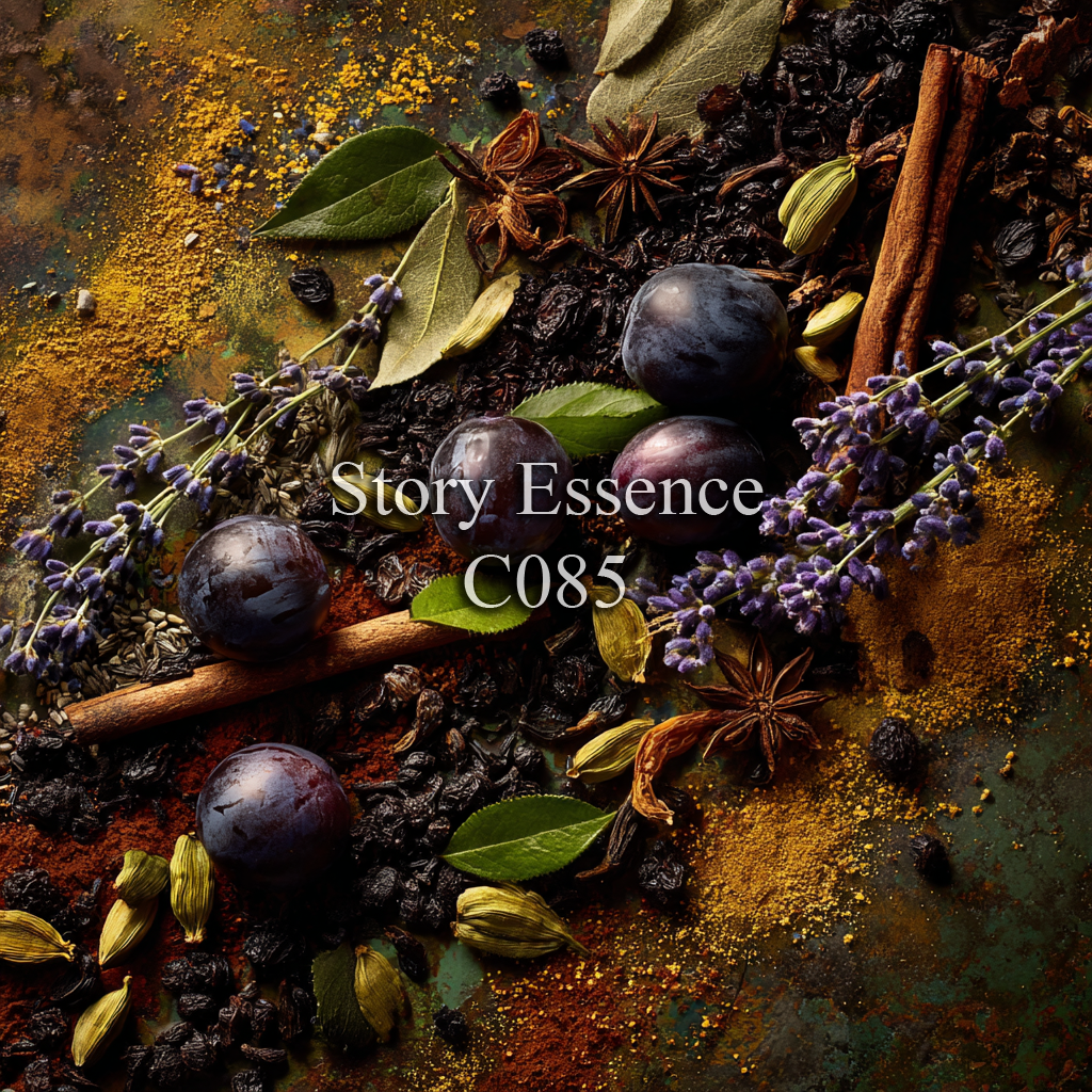 C085 - Es una historia inspirada en Le Male Elixir Absolu, una fragancia masculina que eleva su ADN con profundidad frutal y resinas cálidas. Abre con ciruela jugosa mezclada con toques especiados de canela, cardamomo y cítrico. En el corazón, lavanda aromática se entrelaza con davana y artemisia. Finalmente se asienta en una base rica de tonka bean, benjuí, ambrette, pachulí y lábdano, que aporta textura, dulzura y un final ambarado resonante.