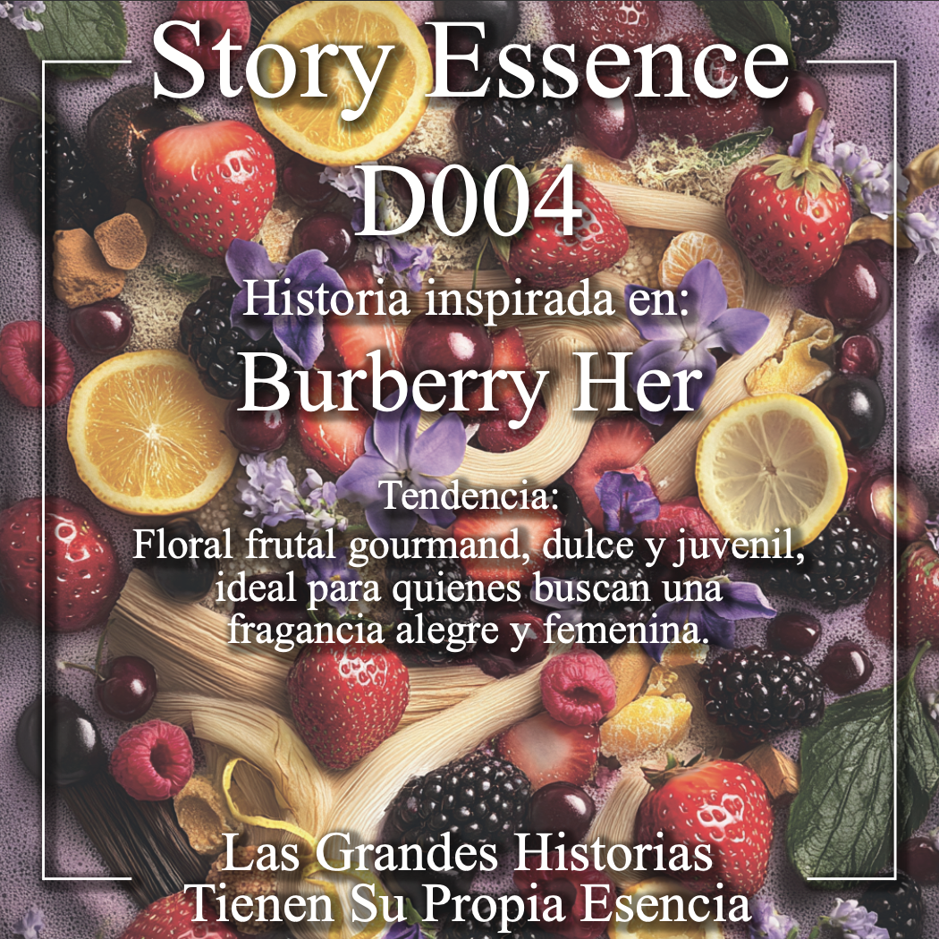 D004 - Es una historia inspirada en Burberry Her. Esta fragancia captura la esencia vibrante y dinámica de Londres, combinando notas frutales y florales que evocan juventud y energía. Su aroma es una invitación a explorar la ciudad con una actitud audaz y aventurera, reflejando la personalidad de una mujer moderna y segura de sí misma.