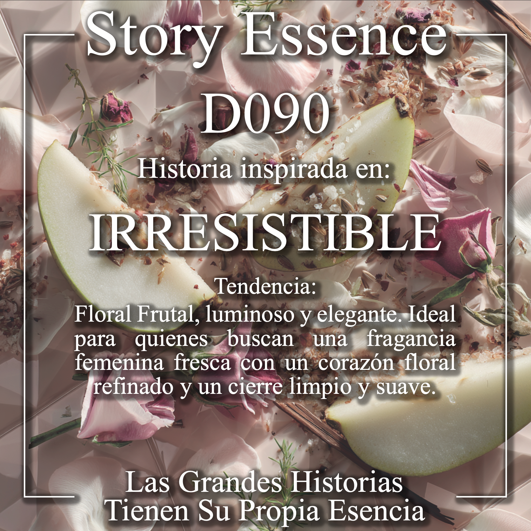 D090 - Es una historia inspirada en Irresistible, una fragancia femenina que se siente como una sonrisa bien puesta: ligera, luminosa y naturalmente elegante. Tiene un aire fresco y jugoso al inicio, se vuelve floral y pulida en el centro, y termina con un velo limpio y suave que acompaña sin invadir, como una presencia encantadora que no necesita exagerar para notarse.