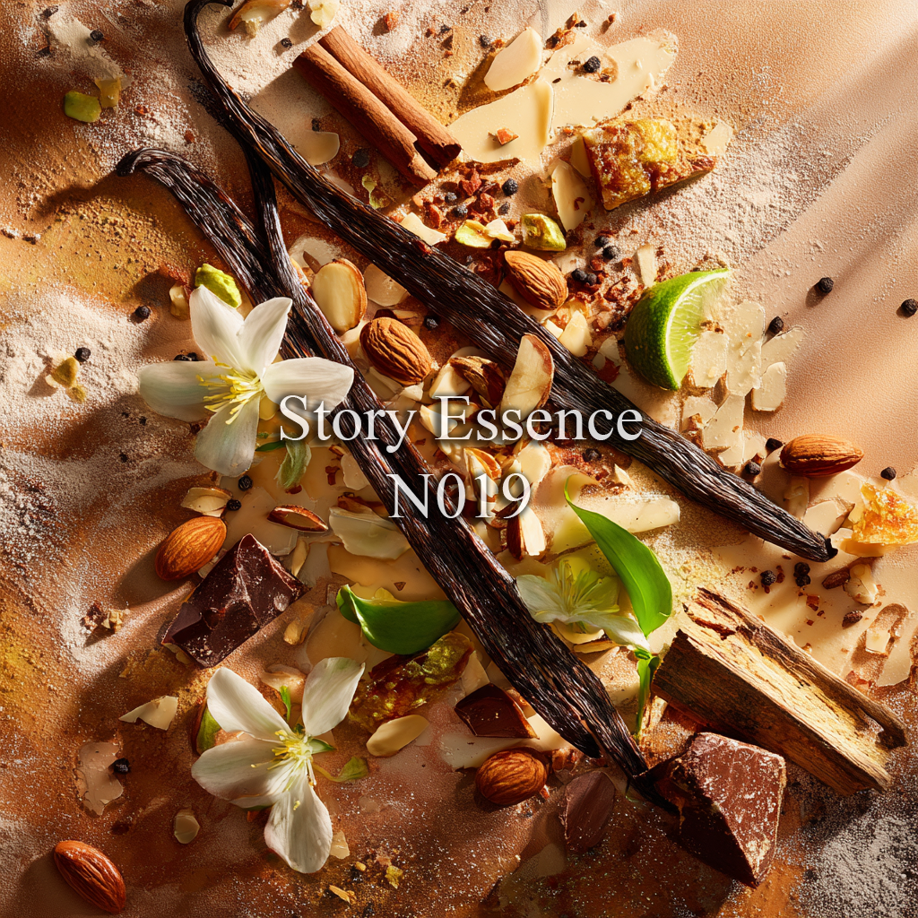 N019 - Es una historia inspirada en Althaïr, una fragancia masculina que combina dulce gourmand con especias y maderas elegantes. Abre con un toque cítrico especiado, se funde en un corazón cremoso de vainilla bourbon, y se posa sobre una base rica de almendra caramelizada y maderas nobles.