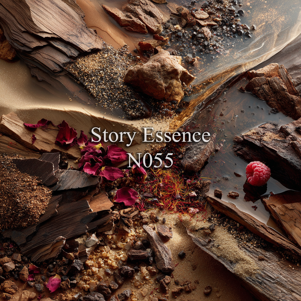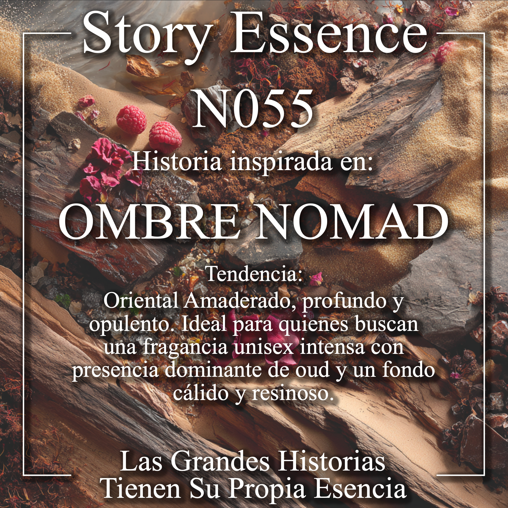 N055 - Es una historia inspirada en Ombre Nomade, una fragancia unisex que transmite profundidad, misterio y lujo oscuro. Su carácter es intenso y envolvente, evocando maderas ardientes, resinas densas y un matiz ahumado que se siente poderoso y sofisticado, como un viaje nocturno a través del desierto.